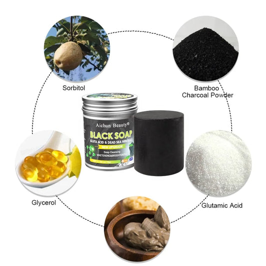 AICHUN BEAUTY Savon Noir Gluta Acide, Minéraux de Mer Morte / Nettoyant en profondeur Acné & Huile Peau Nourrissant Élimine les Cellules de Peau Morte 78 g/2.75fl.ozPrix habituel €7,99 EURPrix habituelPrix unitaire / par-