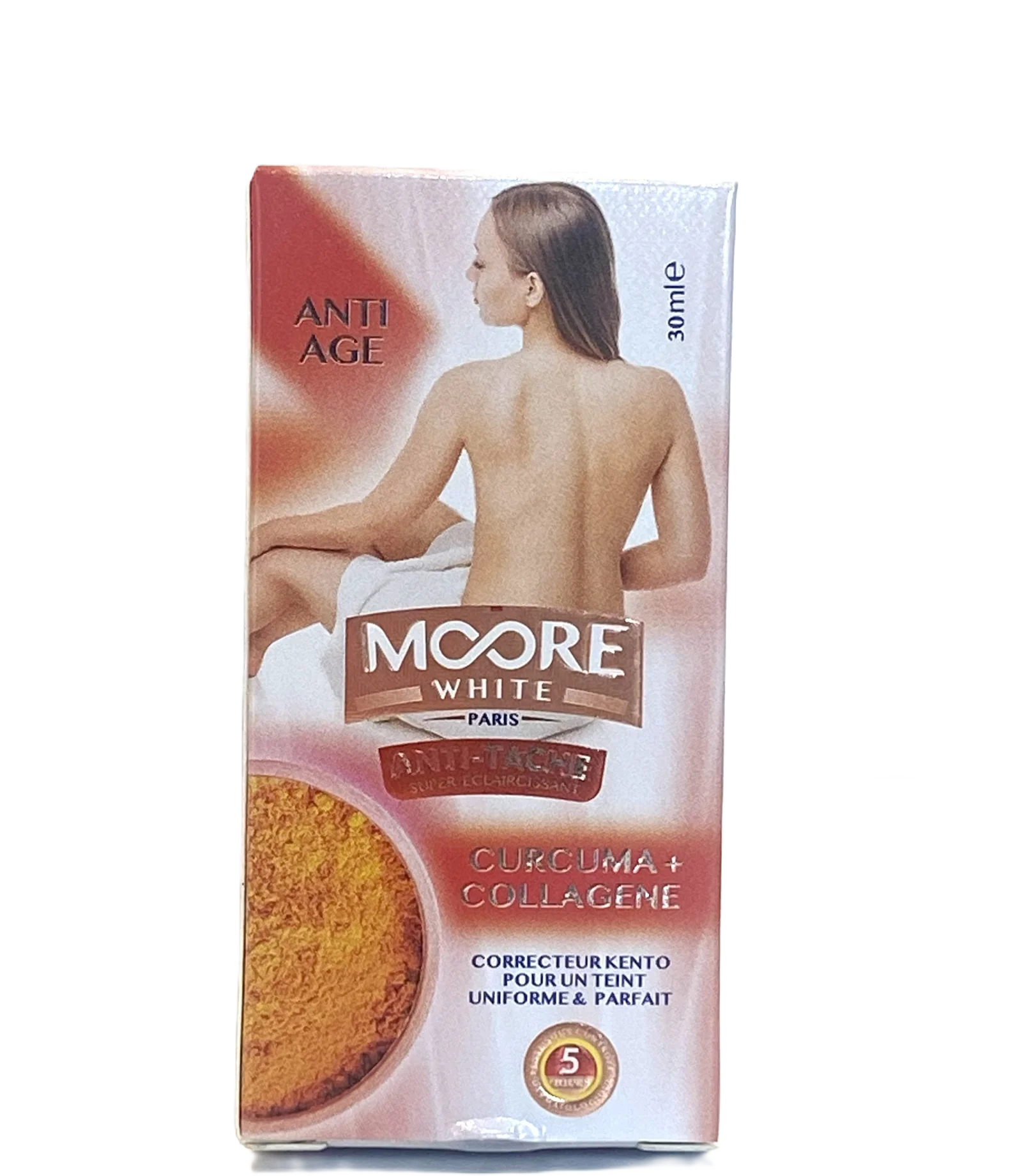 Moore White Anti Tache Super Éclaircissant est formulé pour stimuler le renouvellement cellulaire de la peau. Enrichi en Curcuma et Collagène, ce soin complet allie propriétés Anti-Spot, Anti-Rides et Anti-Âge pour lutter efficacement contre cicatrices, points noirs, boutons et rides. Ce duo concentré, composé d’un sérum et d’une solution de finition, s’adresse aussi bien aux femmes qu’aux hommes, ciblant les taches brunes sur les coudes, phalanges, orteils ou genoux. Une solution puissante et raffinée pour une peau visiblement plus claire et uniforme.